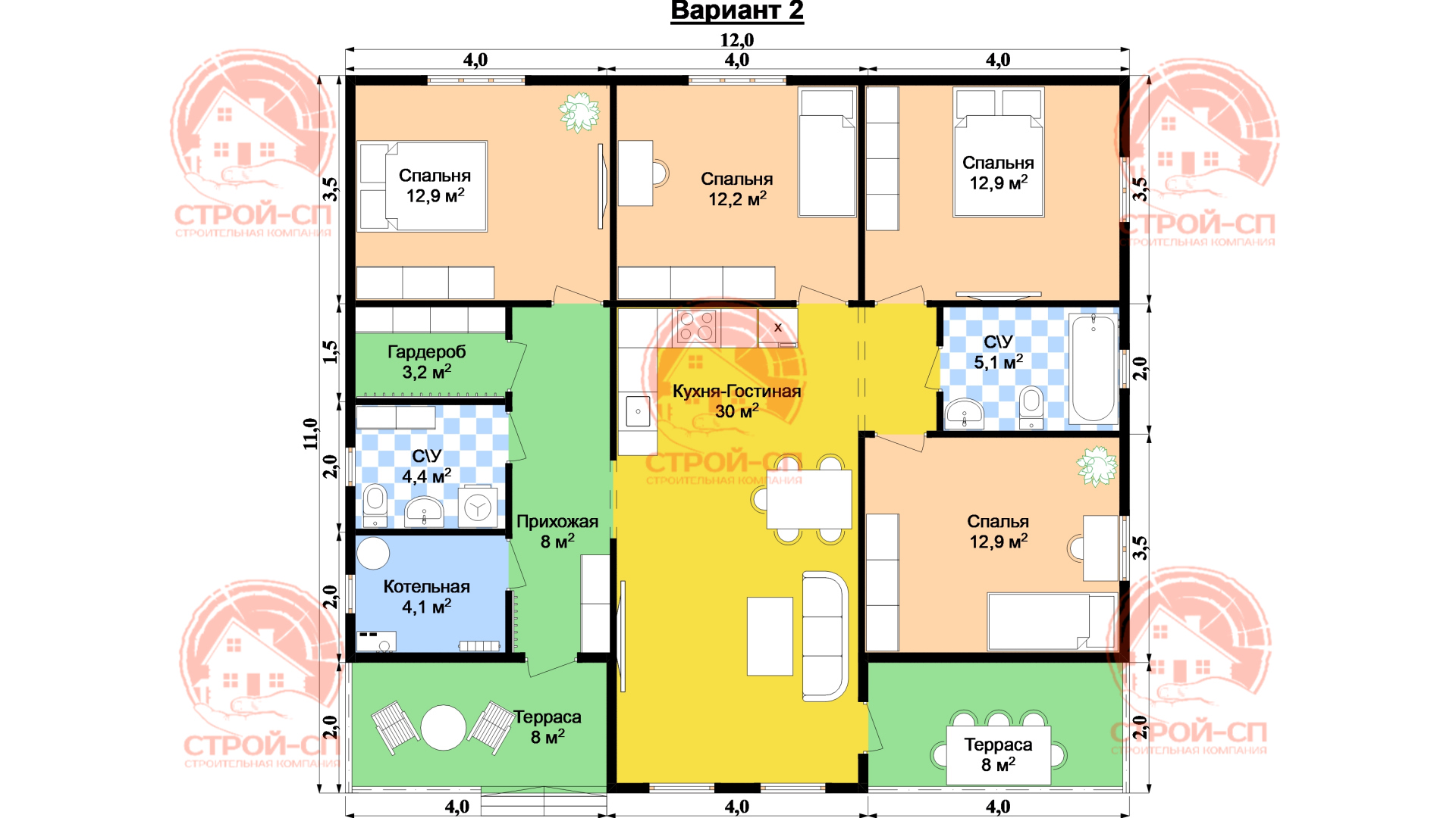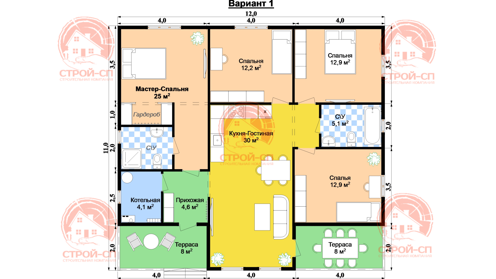 На площади дома в 130 квадратных метров оптимально размещены две террасы, прихожая, удобное помещение под котельную с отдельным входом через прихожую. Три изолированные широкие спальни. Общий санузел. Мастер-спальня с гардеробной и со своим персональным санузлом, и светлая кухня-гостиная с панорамными окнами в пол.